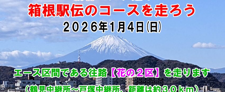 日時: 2026年1月4日 @ 8:30 AM – 4:00 PM場所: 京急線鶴見市場駅年が明けた2026年、箱根駅伝を見てランニングモチベーションが高まっているうちにさっそく体を動かしましょう! 今回走るのは往路のエース区間である花の2区。距離は約30km、ペースは6:30/km程度が目安です。途中でコンビニ休憩や寄り道なども挟みます。箱根駅伝名物の「権太坂」や戸塚中継所手前のゲキサカ「戸塚の壁」などを体験することができますよ。 集合場所は京急線鶴見市場駅、解散場所はJR戸塚駅です。フィニッシュ後、シャワーを浴びて着替えたい方は当店までご案内します。 ご自身の走力や体調、ご予定などに応じて途中離脱もOK!お正月の風物詩、憧れの箱根駅伝の選手になったつもりで個人やグループでぜひ気軽にご参加ください♪ 【開催日】 2026年1月4日(日) 【集合・受付時間】 8時30分~8時45分 【集合場所】 京急線鶴見市場駅 【解散場所】 JR戸塚駅 【解散時間の目安】 16時頃(走行ペース等により多少前後するあり) 【こんな方にオススメ♪】 ・箱根駅伝が好きな方、選手が走ったコースを体験してみたい方 ・レースに向けてロング走の練習をしたい方 ・年末年始で増えてしまった体重を減らしたい方 ・坂ランが好きな方(権太坂、戸塚の壁などを登ります) 詳細、お申込みは以下URLからどうぞ https://moshicom.com/135779/